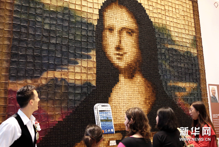 (1)12月1日,顧客在香港K11欣賞新西蘭藝術(shù)家莫里斯·班奈特用6000塊吐司砌成的全球最大的吐司馬賽克畫《蒙娜麗莎的微笑》。