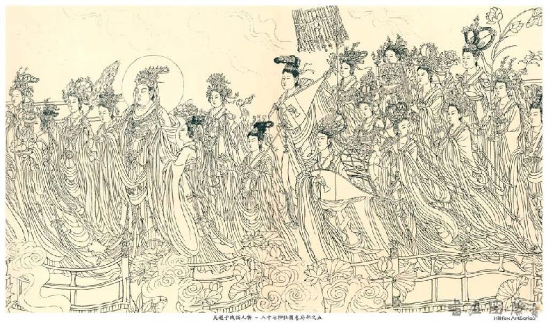 當(dāng)張大千打開《八十七神仙卷》時(shí),不由得大吃一驚,頓時(shí)就呆愣在原地,“嘆為觀止”,并與謝稚柳分別從畫卷場面之宏大、人物比例之精確、神情之華妙、構(gòu)圖之宏偉壯麗、線條之圓潤勁健等方面加以分析說:此卷非吳道子之手筆莫屬。
