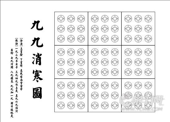 九九消寒圖最早可以追溯到元代。九九消寒圖一般有三種形式:銅錢型、梅花型、文字型。