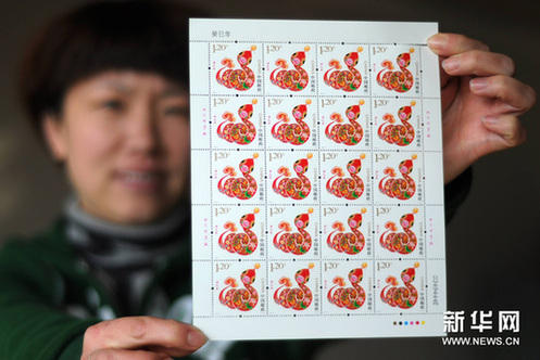 1月4日,山東省濱州市郵政局集郵公司工作人員展示即將發(fā)售的《癸巳年》生肖“蛇”郵票。新華網(wǎng)圖片 張濱濱 攝