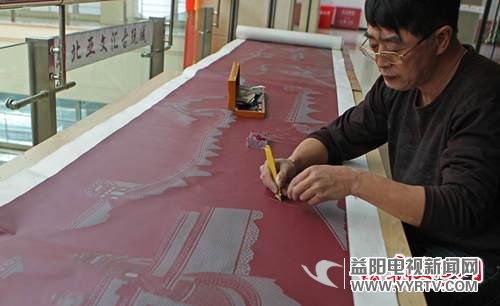 姜世聞?wù)趧?chuàng)作“浮雕紙刻”萬里長城。