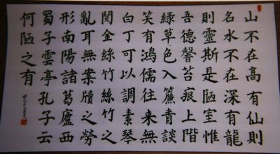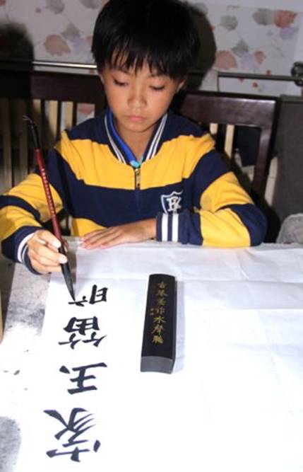 論起書法,計(jì)文哲的爸爸從小練字,已頗見功力,只是沒從名師,不論專業(yè)而已。對于小文哲的教育,其父計(jì)蒸用心良苦,不舍傳統(tǒng)教育,《上下五千年》每天的音頻檢查,到哪個(gè)朝代,哪個(gè)歷史事件,計(jì)蒸提上句,兒子接下句,父子督促,相互提醒,這樣,在兒子先聽后解的基礎(chǔ)上進(jìn)行回顧與講解,幫其理解與記憶。以國學(xué)作為準(zhǔn)則,孔孟之道,儒家思想,經(jīng)常灌疏。家中四尺方桌,只能容一人寫作,于是,父子二人搶先占定,天天 50字,誰先占誰先完成。把枯燥的練字變成了父子間的約定、比賽與爭奪,其中樂趣卻多了起來。