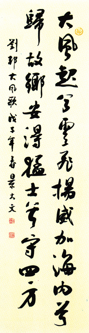 景大文出生于漢劉邦的家鄉(xiāng),自幼沐濡于楚風(fēng)漢韻,書風(fēng)雄強(qiáng)奇崛,用強(qiáng)健的筆力和豪邁的情懷,給人以強(qiáng)烈的視覺和心靈的震撼,屬于“舉杯高歌”的大風(fēng)氣魄,鼓動(dòng)人們心緒燃燒的銅琶鐵拍。