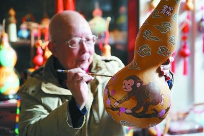 昨天,彩繪葫蘆藝人張苗在制作“五福猴”生肖葫蘆。農(nóng)歷猴年臨近,南京民俗博物館民間藝人張苗,制作特色彩繪生肖葫蘆,喜迎猴年到來。 徐琦攝