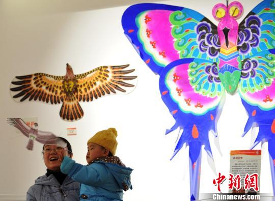 2016年河北省迎新春民間美術作品展上,一位母親帶孩子開心地玩“第什里風箏”。 翟羽佳 攝