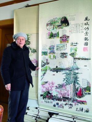 吳怡壽老人已經(jīng)93歲高齡,是土生土長(zhǎng)的泰州人,對(duì)所有景點(diǎn)都非常熟悉。為了創(chuàng)作這幅畫(huà),他帶上相機(jī)乘公交車,去每個(gè)景點(diǎn)至少跑了3次,了解其中的人文歷史,做到胸有成竹。跑完所有景點(diǎn),他花了3個(gè)多月創(chuàng)作完成這幅《鳳城河景觀圖》。