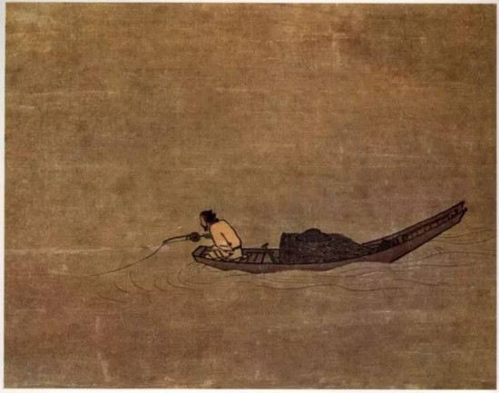 《寒江獨(dú)釣圖》只畫了漂浮于水面的一葉扁舟和一個(gè)在船只上獨(dú)坐垂釣的漁翁,他身體略前傾,全神貫注,或許此時(shí)正有魚兒咬鉤?由于釣者坐在船的一端,故爾船尾微微上翹。四周除了寥寥幾筆的微波之外,幾乎全為空白。然而,就是這片空白表現(xiàn)出了煙波浩渺的江水和極強(qiáng)的空間感,更突現(xiàn)出一個(gè)“獨(dú)”字,襯托了江上寒意蕭瑟的氣氛,從而更加集中地刻畫了漁翁專心于垂釣的神氣,也給欣賞者提供了一種渺遠(yuǎn)的意境和廣闊的想象余地。