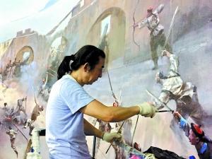 穿過多道“暗門”,記者在一間幾乎封閉的、正在交叉施工的展室內(nèi),見到了畫家許海濤。他正站在一臺已升至約4米高的升降機(jī)內(nèi),右手握著畫筆,對 著墻壁上巨型油畫中的人物,時(shí)而輕點(diǎn)、時(shí)而重涂,專心致志進(jìn)行“雕琢”。畫布上的人物,跟隨著他畫筆的移動(dòng),呈現(xiàn)出越發(fā)精致的神情。