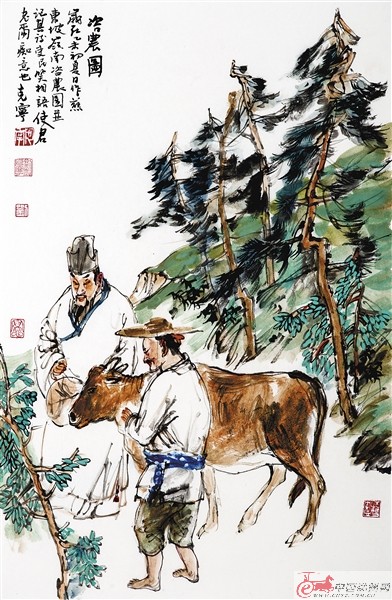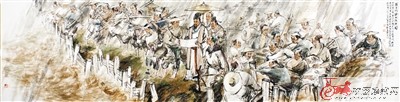 《蘇東坡徐州抗洪圖》對東坡領(lǐng)導(dǎo)抗洪的場面作了深入刻化,畫中暴雨傾盆、蘇東坡冒雨上堤,親率軍民合力治洪,終保徐州平安。