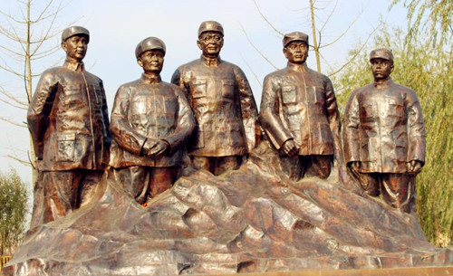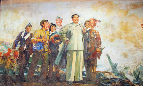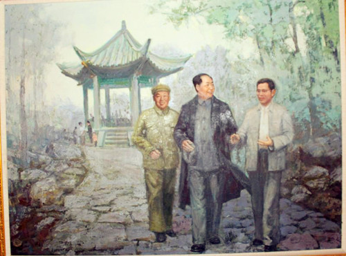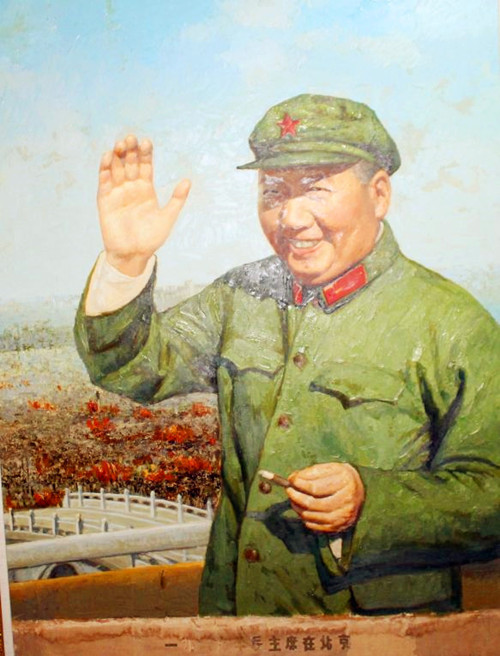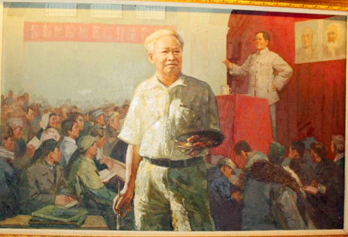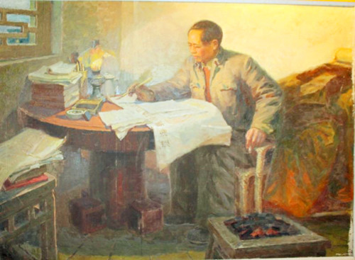 原來,這批油畫是1976年徐州展覽館舉辦的一次“毛澤東思想勝利萬歲的圖片展”。展覽館的吳館長告訴他,方冰山和虞建教授創(chuàng)作的兩幅五米多長的油畫,在76年地震當(dāng)中被用來搭防震棚、蓋煤球了。鐘鑫老師當(dāng)時聽了,心里有一種說不出來的滋味,用現(xiàn)在的話說真是無語。很快,鐘鑫老師從北京高薪聘請專家來來給這一批油畫整理、修復(fù)、制定保管方案,并且陸續(xù)找來作者對原創(chuàng)作品按修舊如舊的方案進(jìn)行修改。他看到偉人油畫的修復(fù)過程,不由的又想起“文革”時期畫偉人的高標(biāo)準(zhǔn)要求。前前后后花了三年多時間,按照文革時期創(chuàng)作偉人油畫的標(biāo)準(zhǔn)對造型、色彩、形象逐一進(jìn)行了調(diào)整。