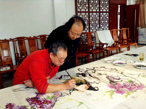 著名畫家朱建強(qiáng)(左一)與參加《翰墨風(fēng)韻》書畫藝術(shù)展藝術(shù)家們