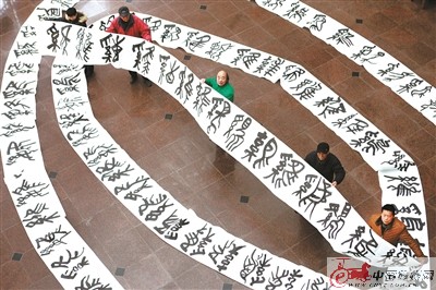 1月17日,徐州市第二老年大學(xué)書法教師劉嵩山,創(chuàng)作了《百雞長卷》迎雞年新春。整幅作品長60米、每個(gè)字高約70厘米,由100個(gè)篆體書寫的“雞”字組成,這100個(gè)雞字形狀各不相同,無一重復(fù)。每個(gè)字都蒼勁有力、變化豐富。劉嵩山稱,書寫100個(gè)雞字,取意“大吉(雞)大利、百篆(賺)百福”之意。 徐州日報(bào)記者 孫井賢 攝