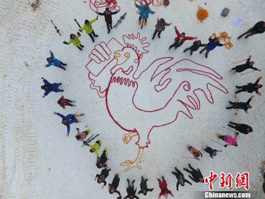 藝術(shù)家雪地里用繩子擺100平米大公雞迎新春