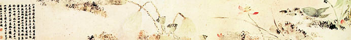 此圖在9米多長的畫面上,展現(xiàn)了荷花由“小荷才露尖尖角”開始,經(jīng)歷含苞待放、初展芳顏、盛開如霞、晚荷似火、花葉飄零,到最后的一池枯索、蓮蓬挺立的 生命過程。以縱逸的筆法,淡雅的色彩,寫出荷花清雅高潔的氣質(zhì)。全卷以寫意的沒骨手法繪花描葉,在色彩、構(gòu)圖上都有連續(xù)的變化,沒有孤立突兀之筆,自有一氣呵成之感。