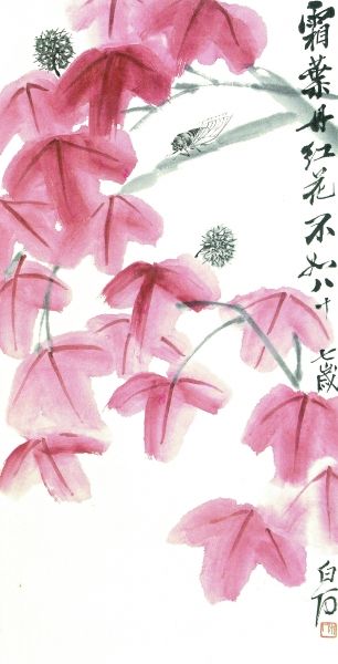 目前可以見到的齊白石最早的草蟲畫是1894年畫的《草葉蛾子》,屬款“三百石印富翁”,是典型的金農(nóng)體,印章也是早期的常用印“木居士”。此外,1902年“沁園師母命畫”的《花卉蟋蟀》團扇,蟋蟀十分工細,花卉以沒骨畫法畫出。這一時期的花卉也是工筆居多,色彩還不亮麗,有些畫作落款書法是金農(nóng)體,明顯是齊白石的早期草蟲畫風格。在1920年未變法前,齊白石還曾經(jīng)以八大山人的冷逸畫法畫過一段時間的寫意草蟲花卉,純用水墨,用筆簡率,構圖舒朗,但在當時并不受歡迎,后來就基本棄之不畫了。