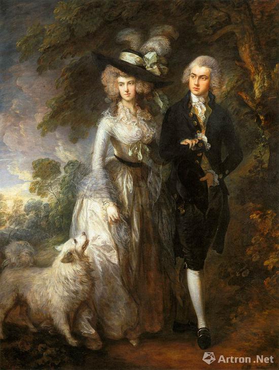 這幅油畫描繪了一對年輕夫婦在樹林中散步的場景,身旁的白色小狗抬頭望向兩人。1954年英國國家美術館以3萬英鎊買下這幅油畫,已保存超過60年。“這幅油畫無疑是庚斯博羅最出色的肖像畫之一,呈現(xiàn)了他的最高繪畫水平,是喬治王時代標志性的一幅肖像畫。”