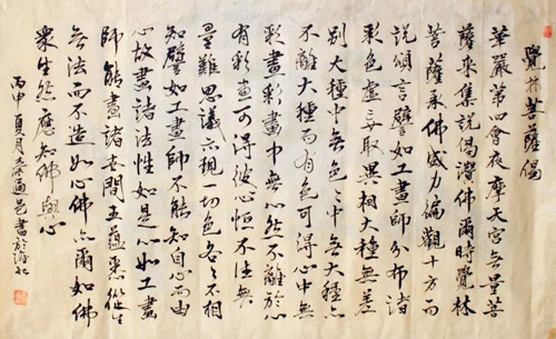 秦通邑潛心研習(xí)書法近四十年,他每天至少練習(xí)五個(gè)小時(shí),數(shù)十年如一日。特別是他的蠅頭小楷寫得那么好,是常人無(wú)法忍受的寂寞狀態(tài)下堅(jiān)持書寫的。如果稍微意志不夠堅(jiān)定也不會(huì)創(chuàng)作出波羅蜜經(jīng)28米長(zhǎng)卷,看到他的這幅作品可以感受到其筆墨精微,這在淮北書法界也算是一個(gè)奇跡。秦先生說(shuō):特別是小楷需要一氣呵成,如果中途被打擾就會(huì)收不到預(yù)期的效果,他寫字的時(shí)候家人也不會(huì)打擾。