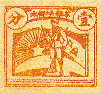 最早出現(xiàn)在郵票上的人民軍隊形象,是對第一次國內革命戰(zhàn)爭時期的紅軍戰(zhàn)士的刻畫——1932年,中華蘇維埃共和國郵政發(fā)行第一套郵票,7枚郵圖上有題為“戰(zhàn)士圖”和“沖鋒圖”的圖案。紅軍戰(zhàn)士持槍(圖②)與沖鋒的形象,第一次出現(xiàn)在郵票上。這套郵票,在普通的白紙和報紙上,以石印版印制,票面粗糙,沒有齒孔,卻是表現(xiàn)人民軍隊形象最早的郵票。1990年,在“中國人民革命戰(zhàn)爭時期郵票發(fā)行60周年”紀念郵票中,郵圖利用“票中票”形式,讓人們再次領略了紅軍戰(zhàn)士的風采。