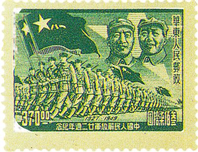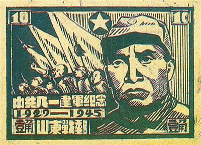 1945年10月,山東解放區(qū)的山東戰(zhàn)時郵務總局發(fā)行了第一枚“中共八一建軍紀念”郵票(圖⑨)。這一枚郵票,主圖是朱德總司令威嚴的戎裝肖像,背景是軍旗引導下的軍隊行進。主圖之外的邊飾,印有“中共八一建軍紀念”“1927—1945”和“山東戰(zhàn)郵”的字樣。