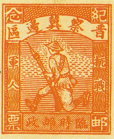 抗日戰(zhàn)爭中,人民軍隊是抗戰(zhàn)的“中流砥柱”。1938年,晉察冀邊區(qū)臨時郵政總局發(fā)行了“軍人免資貼用”郵票,即珍郵“抗日軍人圖”(圖③)。這枚郵票,留下了那個艱苦年代的印記。畫面以質樸簡約的線條,勾勒出抗日軍人持槍向前線的形象。頗具時代感的勁礪的木刻風格,富有動感和感召力,雖不華但有氣度,雖簡單但蘊內涵。紅色的單色印制,又若烽火燃起的戰(zhàn)場,具有引發(fā)聯(lián)想和置身實地的雙重藝術效果。