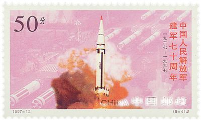 1997年發(fā)行的建軍紀念郵票,以五個篇幅謳歌了軍隊的現(xiàn)代化建設(其一見圖⑦)。在即將進入新世紀,香港剛剛回歸祖國之時,郵圖以簡潔直觀的真實畫面,再現(xiàn)了經歷了70春秋的砥礪前行,走向現(xiàn)代化和已經現(xiàn)代化的這支偉大的武裝力量。
