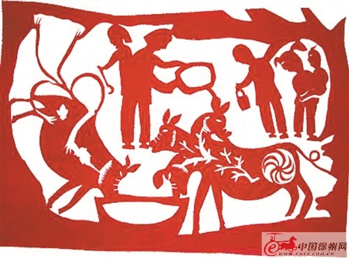 早在2001年時,評論界就有一種說法,說王桂英的剪紙作品借鑒了漢畫像石的表現(xiàn)風格。當年的云龍山廟會,王桂英帶著自己的剪紙作品來賣,馬凱臻曾專門帶著她去漢畫像石館參觀。參觀之后,馬凱臻問她以前有沒有見過漢畫像石。王桂英告訴他,沒有,從來沒有,這是第一次。