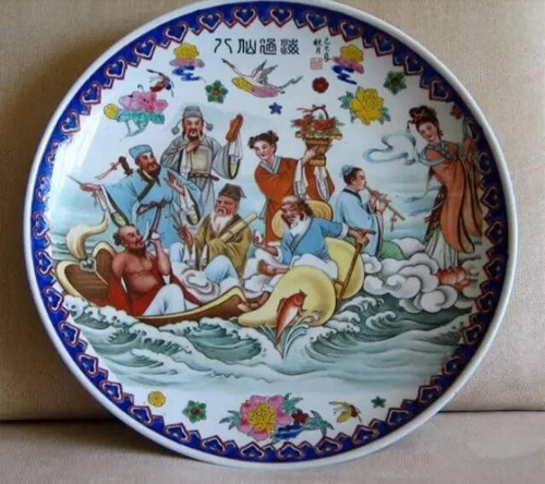 為八仙人各持寶器,下面有大海波濤。俗話說(shuō),“八仙過(guò)海,各顯神通”。八仙人有張果老、呂洞賓、韓湘子、曹?chē)?guó)舅、鐵拐李、漢中離、何仙姑、藍(lán)采和。傳說(shuō)八仙在慶賀王母娘娘壽辰歸途中路過(guò)東洋大海,各自用法寶護(hù)身為舟,竟相過(guò)海,以示神通。