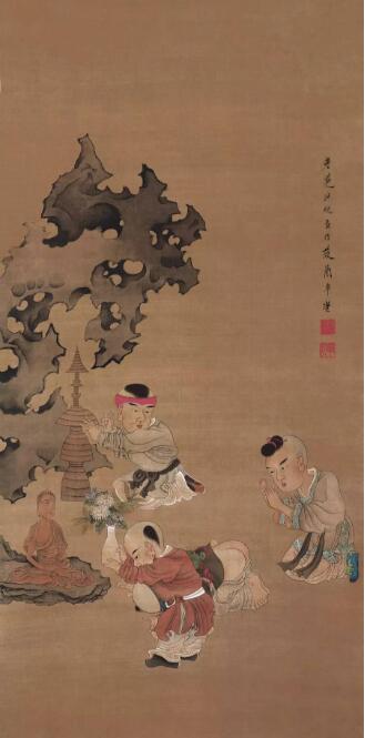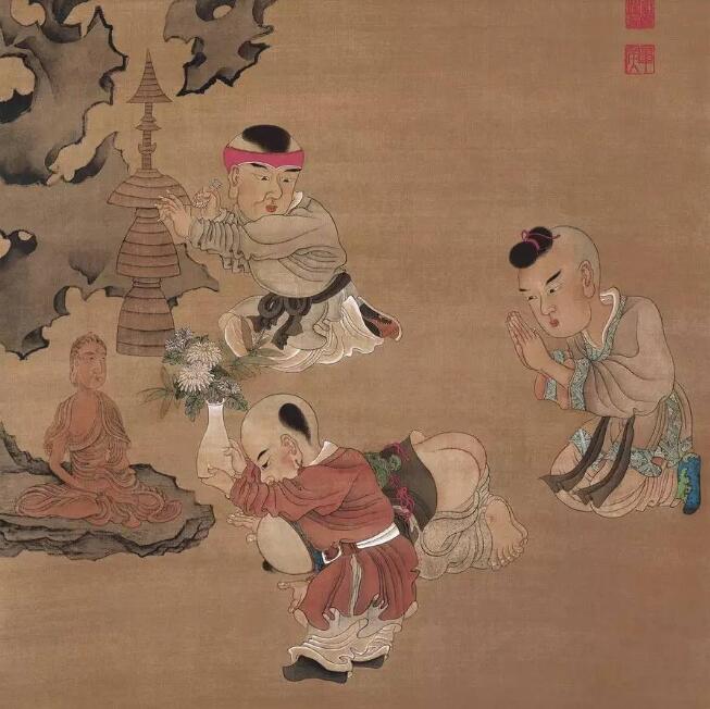 圖中一太湖石豎立,石前放一尊雕琢精致的佛像和供用的銅塔。佛前,兩名兒童在拜佛,一兒童在獻花,另一兒童在跪著擦拭銅塔。四人神態(tài)專注,收斂起頑皮,露出莊重,一名兒童磕頭時,開襠褲露出胖臀,令人忍俊不禁。