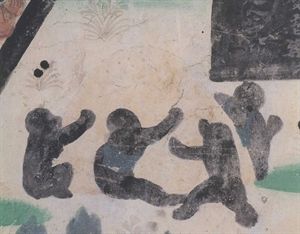 7個孩子在采花,有3個小孩已經(jīng)爬上了大樹,大家或摘或拾,好不熱鬧。那3個爬上樹的小朋友雙足立于獨木,如同歷險一般,他們順便還能“登高”看景,似乎很帶勁。
