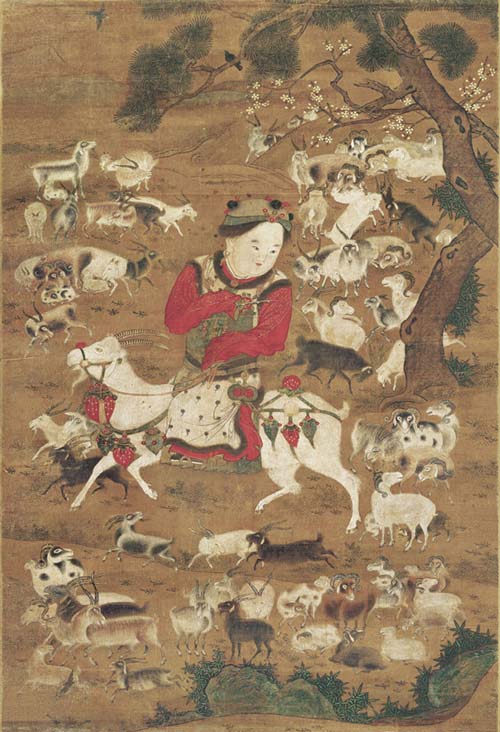 畫中的孩童歡樂地騎在一只大羊背上,身邊圍繞著各色大小造型不一、矯健歡騰的小羊,神氣十足。據(jù)了解,北宋時期的日常生活中,羊并非騎乘的動物,但畫中白羊被配上如神駿寶象般的鞍轡,散發(fā)著非同一般的宮廷貴氣。群羊在草地中或飲,或食,或奔走,或徜徉,悠然自得的環(huán)繞在童子身邊。畫面背后還以長松梅花做背景,點有一雙喜鵲,意取“喜上眉梢”。童子神采飛揚,群羊熱鬧歡騰,整幅畫面充滿了一派富麗祥和之氣。那白胖小子豐潤柔軟的模樣躍然于紙上,栩栩如生,令人心生愛憐。