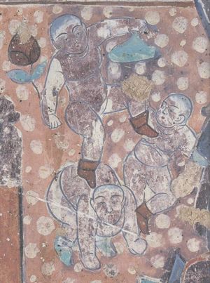 此圖畫中的孩子們在玩“過家家”:一個孩子跪下模仿大人禮佛,一個孩子手抬佛像,還有一個孩子手持水瓶灌佛,另一孩童手捧花籃,裝扮成佛教信徒模樣,模仿浴佛儀式。