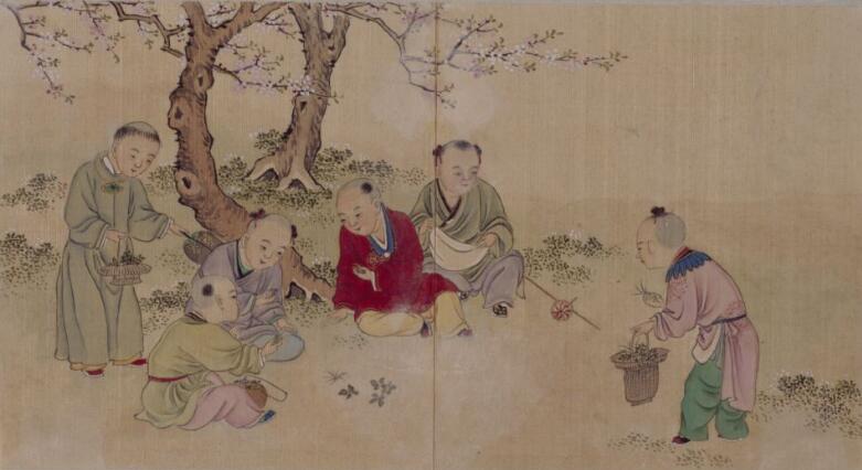 清 佚名《嬰戲圖冊之斗草圖》11×21cm 北京故宮博物院藏