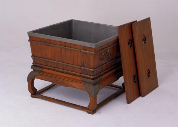 圖中的柏木冰箱上有一對箱蓋,蓋上有4個銅錢紋開光,用于將箱蓋提起。箱內(nèi)設(shè)一層格屜。盛夏時節(jié),天氣炎熱,在格屜下放置冰塊,將食品置于屜板之上,而箱內(nèi)四壁用鉛皮包鑲,可以隔絕外面的熱氣進(jìn)入箱內(nèi),利于冰塊保持低溫,對箱內(nèi)儲藏的食品起到冷凍保鮮的作用。冰箱外部的兩個側(cè)面各安兩個銅提環(huán),以便提拉冰箱之用。冰箱下承柏木座,座面、束腰及鼓腿拱肩處均包鑲銅片,足下連托泥。冰箱造型簡潔實用,設(shè)計巧妙,但由于木冰箱的成本較高,使用場合主要限于宮廷和上層權(quán)貴之家,因此流傳至今的實物并不多見。