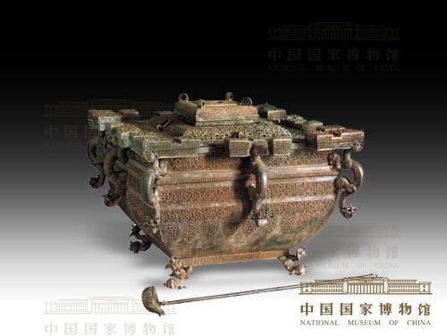 青銅冰鑒是由一個方鑒和一件方尊缶組成的青銅套器,方尊缶置于方鑒內(nèi),其底部一側(cè)有兩個長方形榫眼,另一側(cè)有一個長方形榫眼,安裝時,把這三個榫眼與方鑒內(nèi)底的三個彎鉤扣合,其中一個彎鉤的活動倒鉤自動倒下后,可把方壺固定在方鑒里而不晃動,制作十分巧妙。與青銅冰鑒配套的還有一把長柄青銅勺,勺的長度足以探到尊缶內(nèi)底。