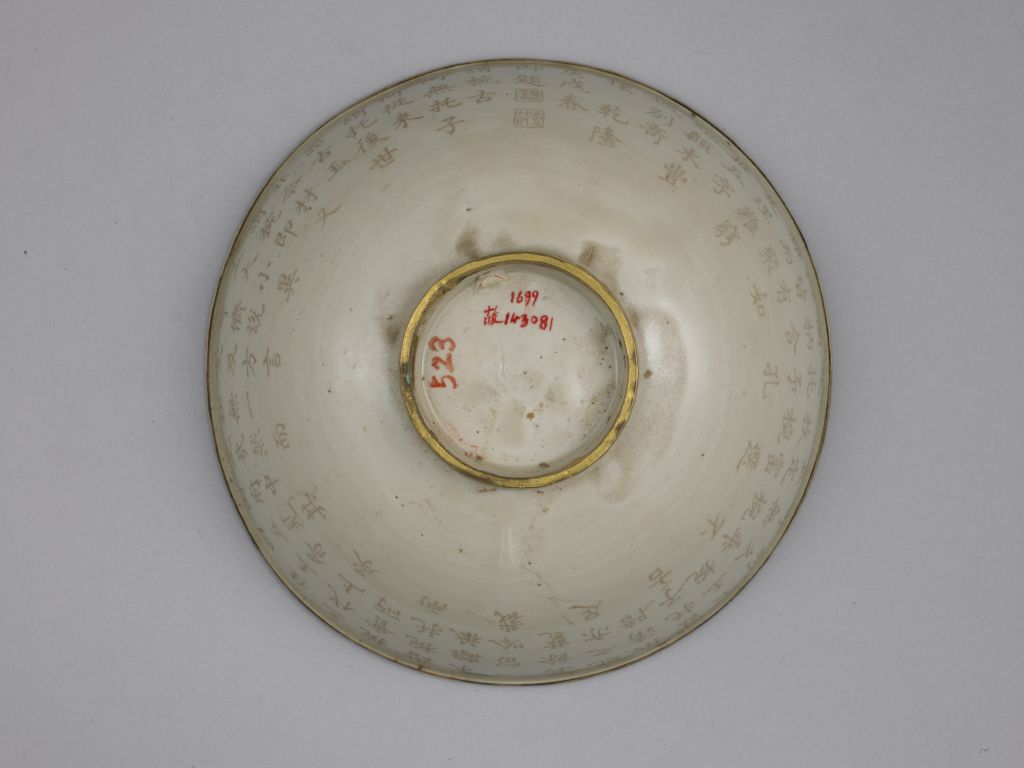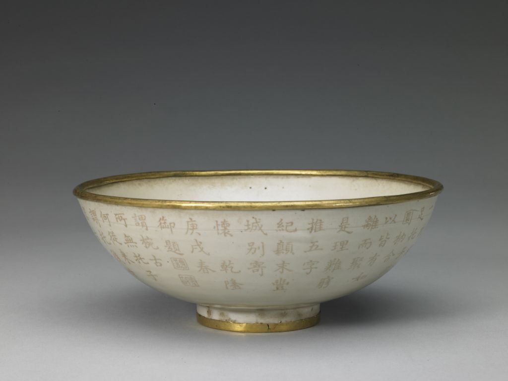 碗敞口,深弧腹,圈足。通體內(nèi)外施釉,釉色灰白,口沿和足沿鑲銅鎏金釦。外壁一周刻乾隆五十五年(1790年)御制《古玉碗托子配以定瓷碗適然成詠》詩:“謂碗古所無,托子何從來。謂托后世器,古玉非今材。又謂碗即盂,大小異等儕。說文及方言,初無一定哉。然而內(nèi)府中,四五見其佳。玉胥三代上,承碗實所諧。碗托兩未離,只一留吟裁。其余瓷配之,亦足供清陪。茲托子古玉,玉碗別久乖。不可無碗置,定窯選一枚。碗足托子孔,圜枘合以皆。有如離而聚,是理難窮推。五字紀(jì)顛末,豐城別寄懷。”后署“乾隆庚戌春御題”,鈐“會心不遠(yuǎn)”、“德充符”兩方印章。