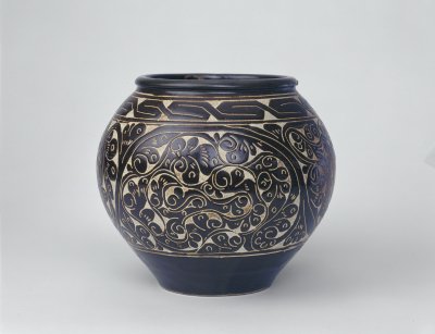 此缸造型渾厚飽滿,黑釉光亮如漆,剔花技法嫻熟,以黃白色的地子襯托黑色花紋,對比鮮明,具有較好的裝飾效果。從其胎釉特征看,應(yīng)是金代山西窯產(chǎn)品。以往由于種種原因,許多金代陶瓷被劃歸于宋代,從而認(rèn)為金代陶瓷無精美之作。1949年以來,隨著金代墓葬中大量陶瓷器的出土,人們對金代陶瓷的真實面目逐漸有了清醒的認(rèn)識,墓葬出土實物和窯址出土標(biāo)本證明當(dāng)時北方的定窯、耀州窯、鈞窯、磁州窯、淄博窯、大同窯、渾源窯、介休窯、長治窯等到了金代仍在繼續(xù)燒造,產(chǎn)品各具特色,且不乏精美之作。