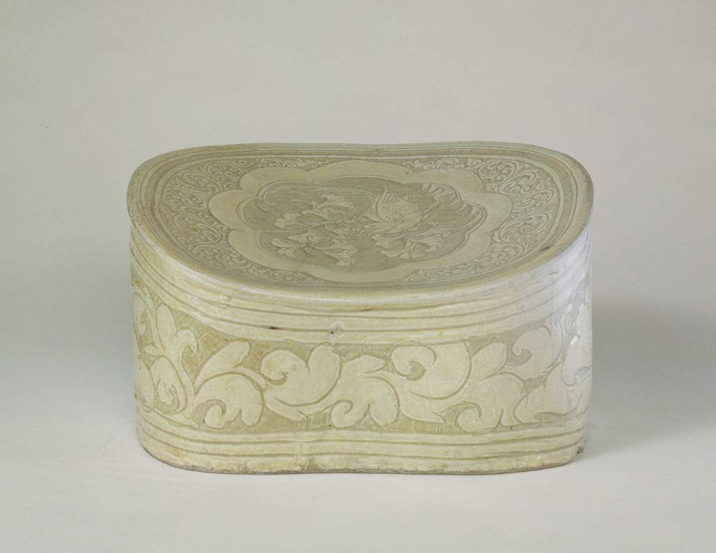 枕呈腰圓形,微出沿,枕面前低后高。胎體施化妝土。枕面中心花形開光內(nèi)剔刻一株折枝花卉紋,枝頭上的綬帶鳥正在振翅鳴叫。開光外飾卷草紋。枕側(cè)上下隨形劃弦紋,弦紋之間剔刻纏枝花葉紋。枕身施透明釉,底不施釉,有兩個圓形通氣孔。