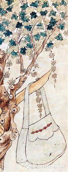 甘肅敦煌莫高窟第17窟北壁有《近事女》圖,約為晚唐時期繪制。“近事女”是指在家受戒的女子,此像畫于高僧洪鞏“影窟”正壁洪鞏塑像之右側,與左側的比丘尼侍者畫像相對照。這些近事女頭梳雙髻,穿男子靴衫,腰部系軟帶,是唐代風行的“時世妝”。她們右手執(zhí)仗,左手持巾子,恭敬地站立在菩提樹下。樹干蒼勁多節(jié),藤蘿纏樹,葉子稀疏。這幅畫最令人稱奇的是,菩提樹上竟然掛著一只造型非常時尚的挎包,這只挎包曾在網(wǎng)上引發(fā)熱議,有網(wǎng)友甚至在國際著名奢侈品“LV”包中找到了同款。