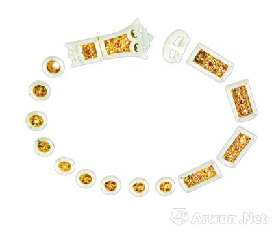長安區(qū)南里王村唐竇曒墓出土、現(xiàn)藏于陜西省考古研究院的唐玉梁金筐真珠蹀躞帶,復原長度1.5米,厚1.2厘米,材質為青白玉,部分泛淺綠。此玉帶借用傳統(tǒng)的金銀錯技術,將黃金鑲嵌在和田白玉內(nèi),玉質溫潤瑩秀,豪華富麗,工藝極為精湛。