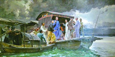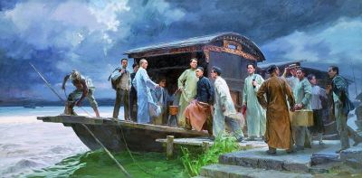 建黨題材的主題美術(shù)創(chuàng)作從表現(xiàn)會(huì)址到表現(xiàn)會(huì)議,是一個(gè)歷史性的發(fā)展過(guò)程,是難點(diǎn)的突破,也是時(shí)代的可能。2009年,隨著國(guó)家重大歷史題材美術(shù)創(chuàng)作工程的啟動(dòng),建黨題材再一次基于黨史而成為這一系列創(chuàng)作中的一個(gè)重要方面。何紅舟、黃發(fā)祥的油畫《啟航》沒(méi)有直接表現(xiàn)會(huì)議,而是以代表們上船的構(gòu)思立意讓人們感覺(jué)到畫家在處理題材上的再一次突破。該作品不僅有南湖紅船這一典型場(chǎng)景,而且代表在上船瞬間的相互關(guān)系,也表現(xiàn)出了這一題材創(chuàng)作中構(gòu)思立意的不同凡響。