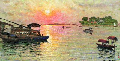 關(guān)于會(huì)議及會(huì)址的創(chuàng)作是建黨題材美術(shù)創(chuàng)作的核心。以嘉興南湖為題材的作品大多有著不同的構(gòu)圖與表現(xiàn)。不管是南湖的煙雨,還是早春,抑或南湖的其他,這里的自然都契合了山水和風(fēng)景表現(xiàn)的形式美感。特別需要指出的是,一批年事已高的畫家的投入,不僅造就了這一題材創(chuàng)作的經(jīng)典作品,同時(shí)也展現(xiàn)了他們晚年創(chuàng)作的時(shí)代特點(diǎn)。69歲的朱屺瞻于1961年創(chuàng)作了油畫《南湖勝跡》;71歲的顏文梁于1964年創(chuàng)作了油畫《南湖》;78歲的錢松喦于1977年創(chuàng)作了中國(guó)畫《南湖》。這三位老畫家雖然屬于同代人,但他們的作品以不同的繪畫形式表現(xiàn),并出現(xiàn)在不同的歷史時(shí)期,有著各自的代表性,同時(shí)反映了建黨題材美術(shù)創(chuàng)作在表現(xiàn)南湖這一具體內(nèi)容上的時(shí)代特點(diǎn)。毫無(wú)疑問(wèn),他們的作品除了自身的成就和特色之外,還在這一題材的美術(shù)創(chuàng)作中具有示范性的作用,對(duì)于推動(dòng)這一題材的美術(shù)創(chuàng)作,包括吸引后來(lái)的畫家到這一地區(qū)寫生,都具有重要的意義。