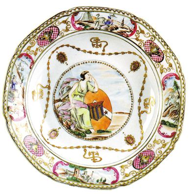 18世紀(jì),廣彩藝人用作繪制底版的圖片,主要包括歐洲的油畫(huà)、銅版畫(huà)、素描,甚至漫畫(huà)和諷刺畫(huà)、書(shū)籍插圖等。這些圖像在昏暗的船艙中經(jīng)過(guò)漫長(zhǎng)的海上顛簸,被送到一批批之前對(duì)它們一無(wú)所知的東方陶瓷畫(huà)師手中。外來(lái)的式樣刺激著畫(huà)師們的神經(jīng),那些古希臘、古羅馬的神話(huà)故事和世俗生活,那些陌生的山脈、峽谷、橄欖油和葡萄酒,給他們的手腕注入了新的活力。他們成功地繪制出了從風(fēng)格到色彩都和中國(guó)傳統(tǒng)陶瓷繪畫(huà)明顯不同的樣品,立體、透視、明暗,讓初次見(jiàn)到它們的國(guó)人大為吃驚。