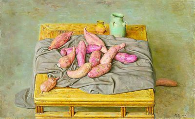 朱春林的景,常磊的物,也在表達(dá)著一個古典主義者的超然理性——“萬物皆有秩序”。在看似隨意截取的北方景色和窯洞里,美的秩序井然而在;在隨意堆放的蘿卜、紅薯、藕和梨里,形色之美悄然而至。萬物無貴賤,秩序賦予美——這是事實(shí),也是信念。