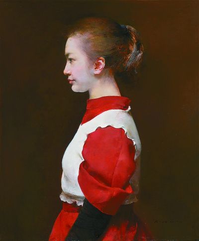 這種超然物外的姿態(tài),在展出的肖像畫中也同樣表現(xiàn)出來。楊飛云的《簪花仕女圖》維系著他的新仕女肖像慣有的“可遠(yuǎn)觀而不可褻玩”的距離感,即令走出畫室深入百姓生活所畫的普通人系列肖像中,肖像人物雖然已經(jīng)嵌置于其生活的空間,但直視的目光,還是讓人感覺到了互為“他者”的陌生。徐芒耀的《英子》、郭潤文的《萌娃》、李貴君的《迷失》、朱春林的《報(bào)喜天使》、常磊的《美卉》畫的全是女孩,又何嘗沒有這種難以言說的距離和超然呢?郭潤文給他畫的一幅紅衣女青年的側(cè)面肖像取名為《距離》,他要刻意保持的距離,到底是什么呢?沒有距離,就沒有超然物外的姿態(tài),也就失去了藝術(shù)的表達(dá)。因此,七位油畫家潔身自好的距離和超然,便獲得了堅(jiān)守藝術(shù)的詮釋,因而彌足珍貴。