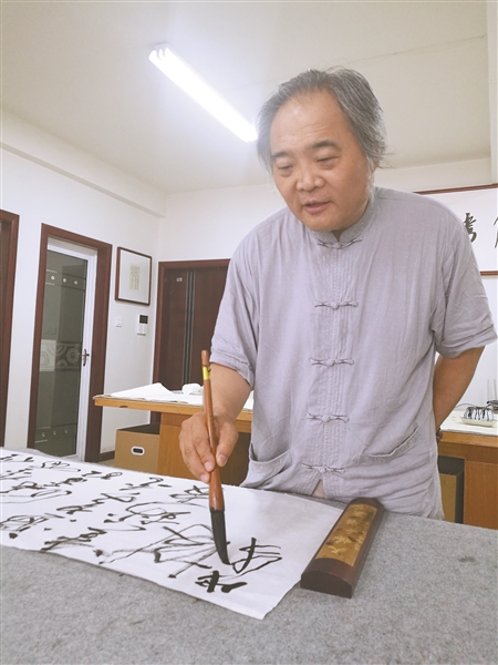 曹元偉在潑墨揮毫,練習(xí)書法。