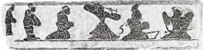 “游戲人生,賓主二人投壺正歡;對(duì)酒當(dāng)歌,彪形大漢酩酊大醉。”投壺畫(huà)像石所刻畫(huà)像為漢代十分流行的一種宴席間飲酒游戲——投壺。在酒宴上,席中放置一壺,賓主二人分坐左右,懷中各抱數(shù)矢(箭)向壺中投擲,投入壺者為贏,不入者為輸,輸者罰酒一杯。此畫(huà)中刻一壺,壺內(nèi)已投入兩矢,旁置一酒樽,壺左右二人各抱三矢,另一手各持一矢,欲投向壺中。畫(huà)右一名站立者為司射(即裁判)。畫(huà)左邊一名彪形大漢被一侍者攙扶,從其頭重腳輕、兩眼呆滯、吃力聳肩的形象,我們一看便知他是投壺場(chǎng)上的敗將,不勝酒力而狼狽下場(chǎng)。
