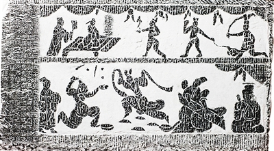 生產(chǎn)勞動(dòng)畫(huà)像石主要表現(xiàn)當(dāng)時(shí)“耕耘”“捕魚(yú)”的場(chǎng)景。建筑類(lèi)畫(huà)像石上刻有雙闕、廳堂、樓閣等,是漢代建筑成就的生動(dòng)體現(xiàn)。歷史故事類(lèi)石刻主要題材是二桃殺三士、鴻門(mén)宴、西門(mén)豹除巫治鄴、趙氏孤兒等歷史故事,渲染儒家忠孝仁義的道德觀念。社會(huì)生活類(lèi)畫(huà)像內(nèi)容龐雜,有達(dá)官顯貴投壺宴飲、車(chē)騎田獵、斗雞走狗、往來(lái)拜謁等生活場(chǎng)景,也有擁彗、端燈、捧奩、執(zhí)戟持盾等諸多奴婢侍吏的形象。天文與神話(huà)類(lèi)有日月同輝、日月合璧、北斗星、彗星、蒼龍星座等,還有一些是與天文相關(guān)的神話(huà)故事,諸如日神月神、嫦娥奔月、羿射十日、雷公、風(fēng)伯、雨師、河伯以及伏羲、女?huà)z等。角抵類(lèi)畫(huà)像有擊技、斗兕(sì)、刺虎、斗牛等,這些畫(huà)像中的人和動(dòng)物均形象夸張,富有感染力,展示了崇武尚力的時(shí)代精神。在舞樂(lè)百戲類(lèi)畫(huà)像中,有各種舞蹈、雜技和樂(lè)器演奏形象,建鼓舞、七盤(pán)舞各展風(fēng)姿,飛劍跳丸、沖狹倒立英氣逼人,再現(xiàn)了漢代歌舞升平的繁華盛景。祥瑞升仙類(lèi)畫(huà)像有龍、鳳、鹿、龜?shù)戎T多祥禽瑞獸,更有羽人戲龍、乘龍騎虎的升仙場(chǎng)景。這些畫(huà)像正是漢代盛行的天人感應(yīng)、靈魂不滅思想的圖像化反映。