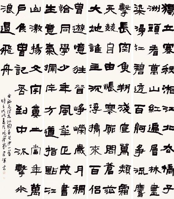 在我看來,簡單將小幅作品書寫內(nèi)容來填滿大尺幅作品,與大尺幅作品原理是背道而馳的,簡單將小作品填滿,非但達(dá)不到?jīng)_擊力,更會影響整體表達(dá),形成錯(cuò)位。第二,大字不見其大。大尺幅書法不等于放大的書法作品,書法的大與小,是一個(gè)對比過程當(dāng)中產(chǎn)生的概念,大尺幅作品不能追求物理空間,而忽視作品的宏大。
