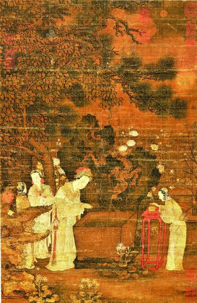 現(xiàn)藏于臺北故宮博物院的五代佚名畫家所繪《浣月圖》,畫面生動,頗具生活氣息。畫中明月皎潔,高掛天際。庭院深處,種植著虬松、梧桐與芭蕉,枝葉蒼郁茂盛,地面有芙蓉、蜀葵、雛菊等花卉,競吐芳香。奇石上盤踞的蟠螭,正低伏泄水,池中波紋蕩漾。畫面中間一位盛裝婦人,欠身望向水中月。旁立侍女三人,或臨案焚香,或捧奩,或荷琴。此畫氣氛清雅,真正是一派花好月圓景象。