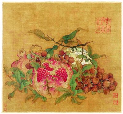 中秋美食豐富多樣,畫家筆下的花果佳肴也姿彩斐然。美國波士頓美術(shù)館藏有南宋畫家魯宗貴的《吉祥多子圖》,畫中的橘子、葡萄和石榴采用鮮艷明麗的色彩和密集的構(gòu)圖,果實在綠葉的穿插映襯下顯得格外突出,黃、紅、綠、白多種顏色絢爛多彩。橘子、葡萄和石榴都是中秋時節(jié)受歡迎的花果,在中國傳統(tǒng)風(fēng)俗中,這三種水果還具有多子多福的寓意,喜慶吉祥。